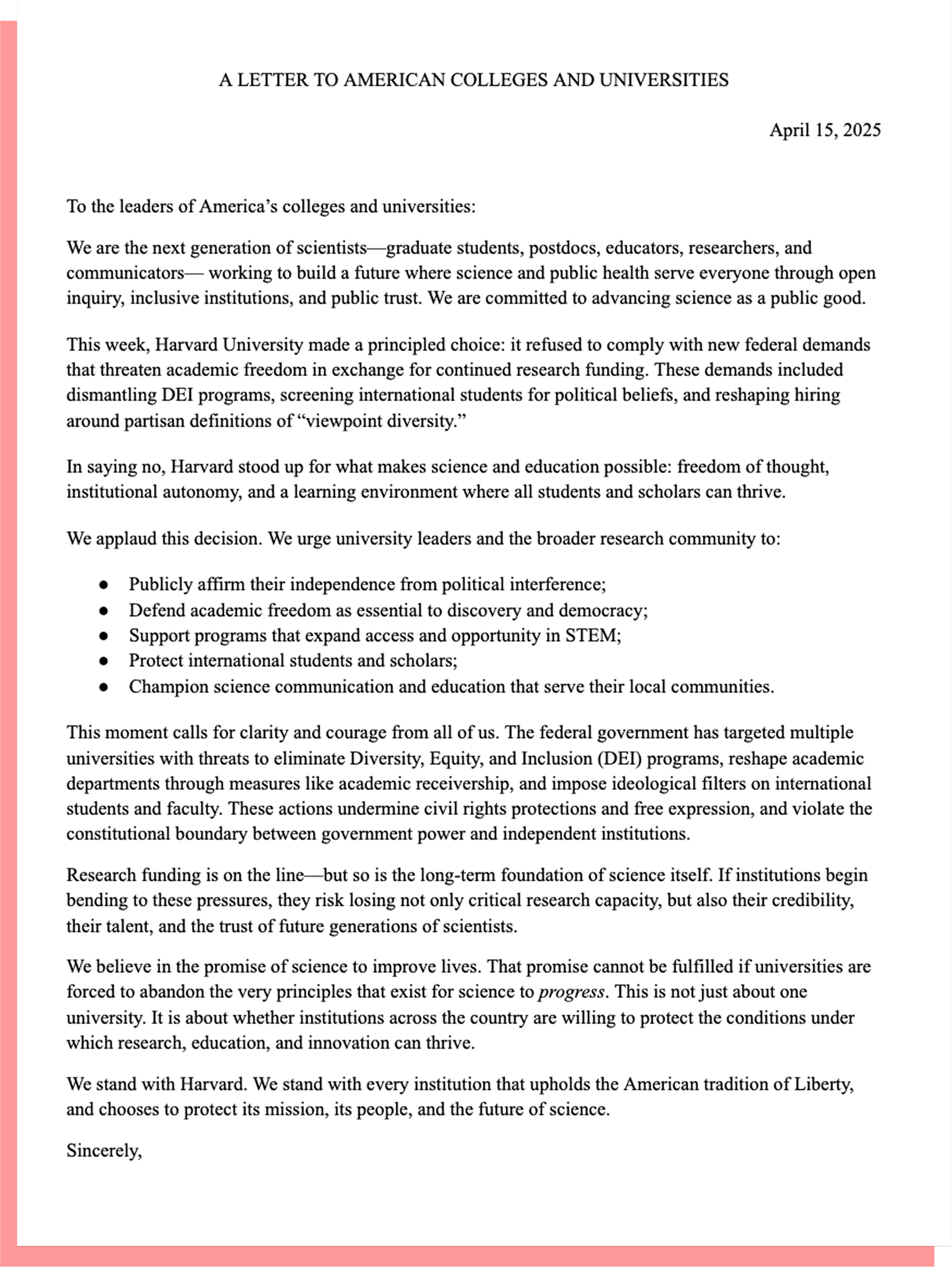 That’s why we’re launching this open letter. We’re early-career scientists calling on our peers, mentors, and institutions to defend the future of science, scholarship, and public health. We believe the freedom to teach, learn, and ask hard questions is essential—not just to academia, but to democracy itself.